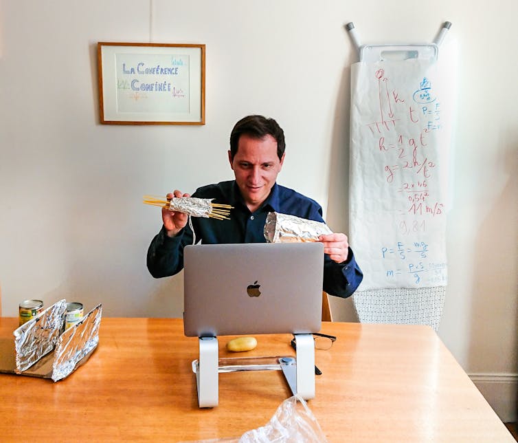 Cette conférence m’a demandé autant de travail que les autres. Mais le confinement est là, et les gens se montrent reconnaissants de l’effort pour surmonter les difficultés du contexte. Eux-mêmes vivent aussi ce quotidien contraint et imaginent mes problèmes : demander à ma famille de rester cachée et silencieuse le temps du tournage, fabriquer des maquettes maison, mesurer la gravité avec un escabeau, transformer sa table à repasser en tableau noir…