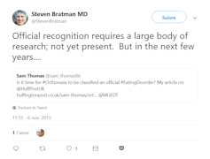 S. Thomas :« Est-il temps que l’orthorexie soit officiellement classée comme trouble du comportement alimentaire ? » S. Bratman : « La reconnaissance officielle exige un important corpus de recherche, qui n’existe pas encore. Mais au cours des prochaines années…» @StevenBratman