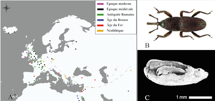 Le charançon du blé (Sitophilus granarius) est connu depuis l’Antiquité pour causer des dégâts importants dans les stocks de céréales. Il s’agit d’une espèce qui pond et réalise son développement larvaire dans les réserves de grains entreposés (blé, seigle, orge, etc.) et qui n’a donc pas besoin de la plante vivante pour se nourrir. Cet insecte a la particularité d’être aptère, c’est-à-dire dépourvu d’ailes, ce qui le rend dépendant des migrations humaines pour ses déplacements. En accompagnant les transferts de céréales, son handicap lui donne donc le statut privilégié de témoin des transports de grains à longue distance et de leur intensification au cours de l’Histoire.