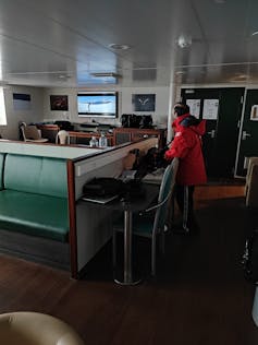 Profitant de la traversée pour commencer des observations et quelques entretiens, je suis postée la plupart du temps dans le salon passager, scindé en deux espaces confortables avec fauteuils, canapés, grande télé…
