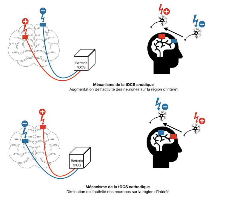 On distingue deux types de stimulation : anodique, qui augmente l’activité des neurones, et cathodique, qui réduit ou inhibe l’activité des neurones.
